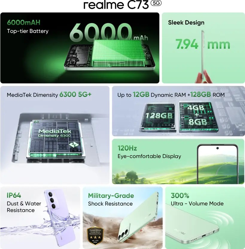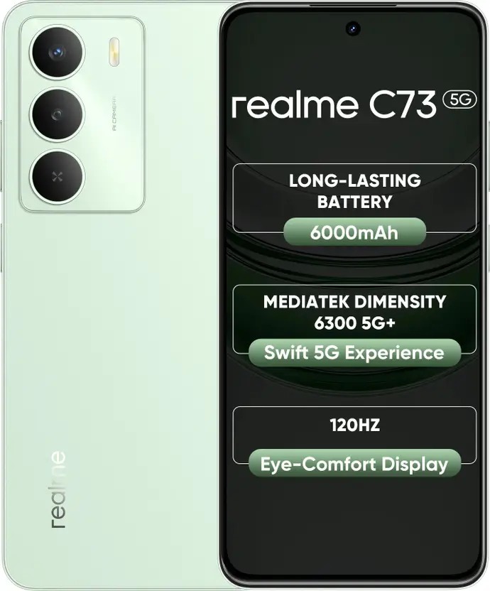 Total cost of products in cart must be ₹1,500.00 or more Sale! Realme C73 5G₹9,200.00 – ₹10,400.00Price range: ₹9,200.00 through ₹10,400.00 16.94 cm (6.67 inch) HD+ Display 32MP Rear Camera | 8MP Front Camera 6000 mAh Battery Dimensity 6300 Processor STORAGE & RAM Choose an option4/1284/644/1284/64 COLOUR Choose an optionCrystal PurpleJade GreenOnyx BlackCrystal PurpleJade GreenOnyx BlackClear Realme C73 5G quantity Add to cart SKU: N/A Categories: Mobile Phones, Realme, Smart Phones Brand: Realme Description Additional information Reviews (0) Description 16.94 cm (6.67 inch) HD+ Display 32MP Rear Camera | 8MP Front Camera 6000 mAh Battery Dimensity 6300 Processor Additional information STORAGE & RAM 4/128, 4/64 COLOUR Crystal Purple, Jade Green, Onyx Black Reviews There are no reviews yet. Be the first to review “Realme C73 5G” Cancel replyYour email address will not be published. Required fields are marked *Your rating * Rate… Perfect Good Average Not that bad Very poor Your review *Name * Email * Save my name, email, and website in this browser for the next time I comment. Related products Sale! VIVO T4 5G FRESH ₹22,800.00 – ₹24,800.00Price range: ₹22,800.00 through ₹24,800.00 Select options This product has multiple variants. The options may be chosen on the product page Sale! VIVO Y400 5G ₹18,500.00 – ₹20,200.00Price range: ₹18,500.00 through ₹20,200.00 Select options This product has multiple variants. The options may be chosen on the product page Sale! VIVO Y31 Pro 5G ₹16,750.00 – ₹18,450.00Price range: ₹16,750.00 through ₹18,450.00 Select options This product has multiple variants. The options may be chosen on the product page Sale! OPPO A5 Pro5G ₹14,650.00 – ₹16,600.00Price range: ₹14,650.00 through ₹16,600.00 Select options This product has multiple variants. The options may be chosen on the product page